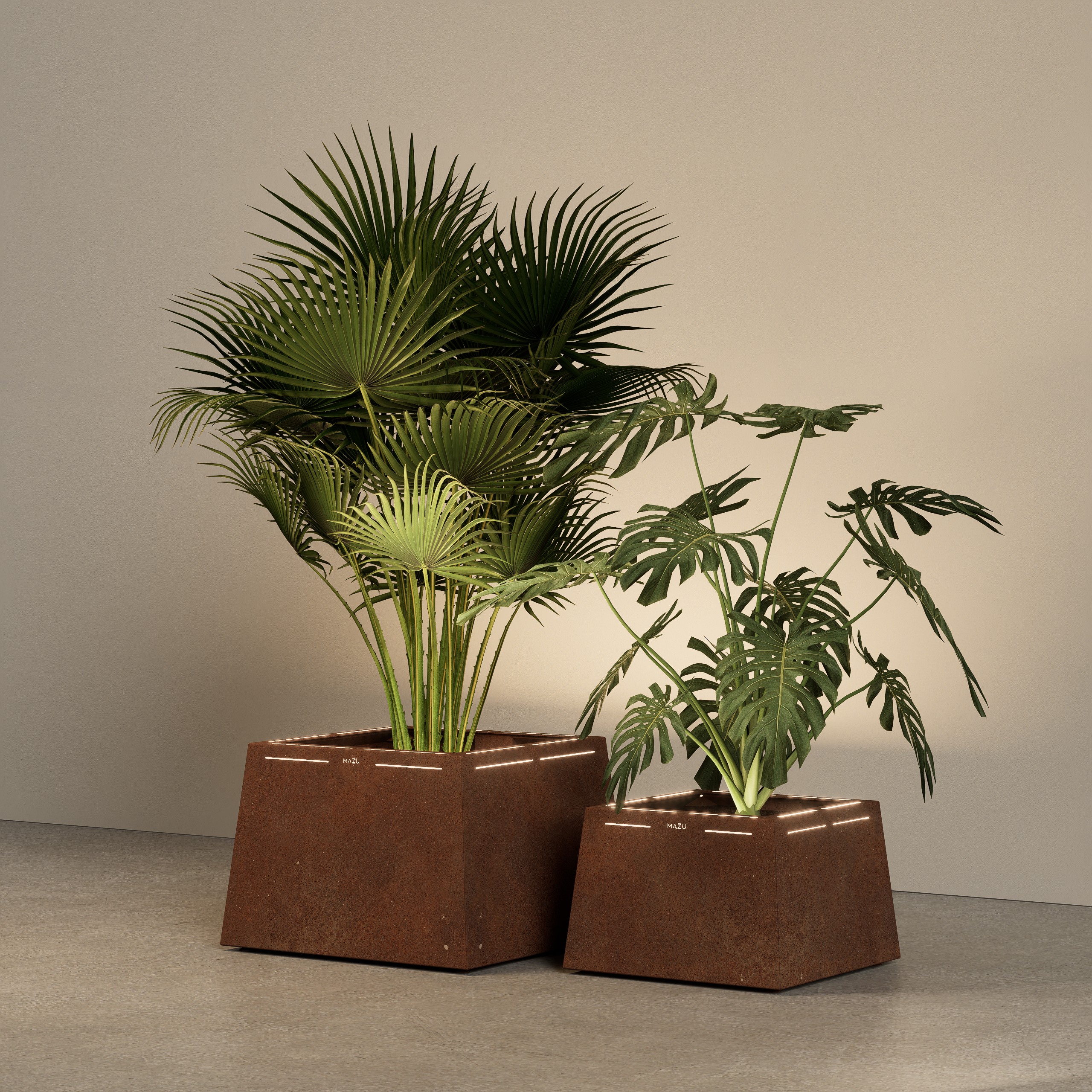 This planter features a bold square shape with clean lines and a wide base, finished with a subtle band of indirect light along the top edge, creating a stylish and practical statement for any space.